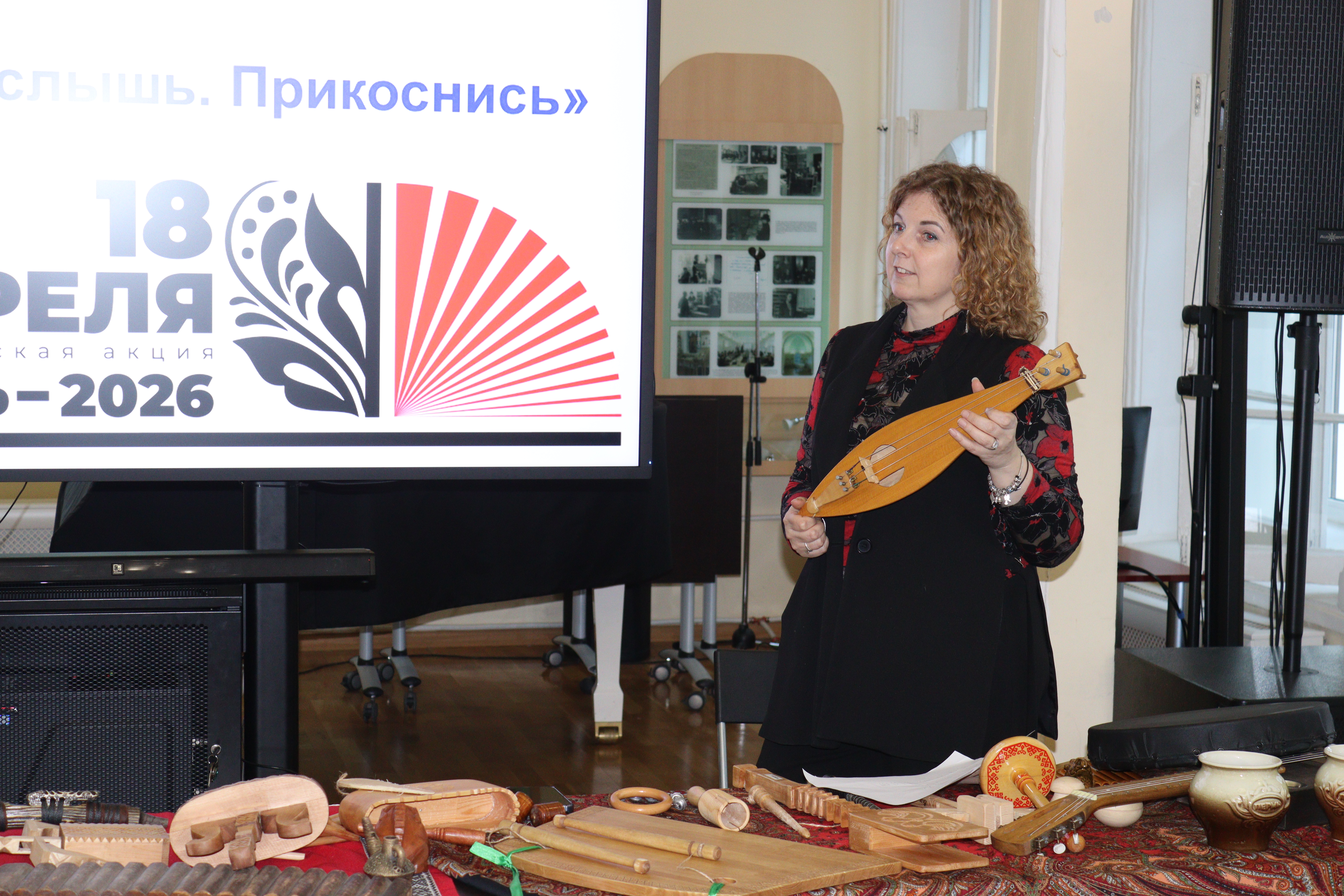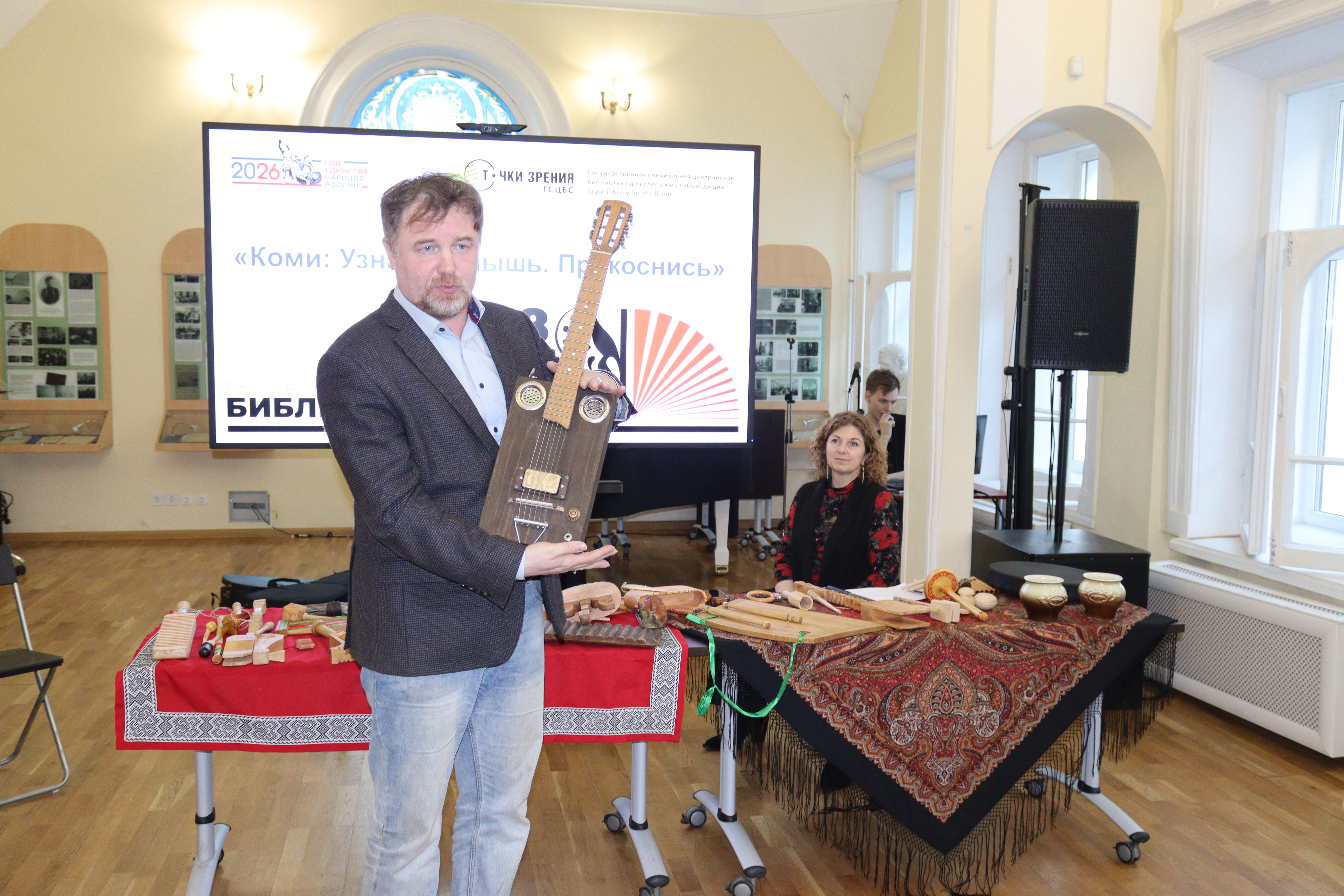 Важным событием вечера стало открытие передвижной тактильной выставки «Звуки родного края: коми национальные музыкальные инструменты». Экспозиция привезена из Специальной библиотеки для слепых Республики Коми им. Л. Брайля и адаптирована для незрячих посетителей. На выставке читатели могут в буквальном смысле «прикоснуться» к культуре коми, изучить устройство и фактуру народных инструментов руками.